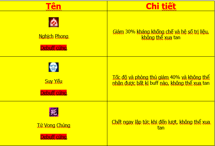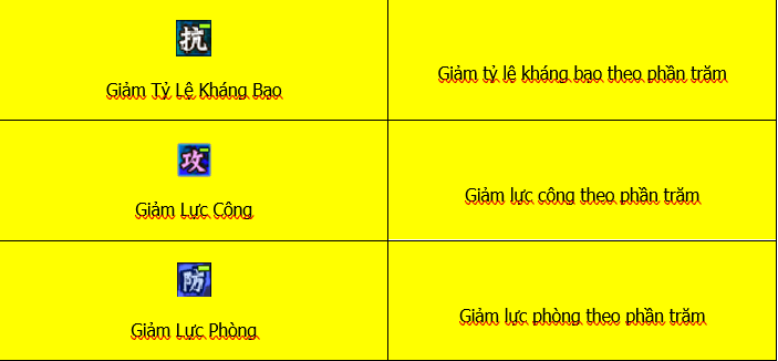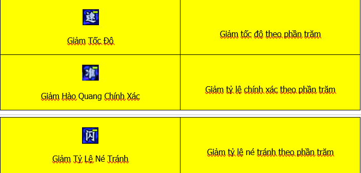 + Các hiệu ứng DeBuff trái ngược với hiệu ứng Buff các hiệu ứng này sẽ gây ảnh hưởng xấu đến các chỉ số của team địch, ví dụ các như các hiệu ứng giảm vật công, phòng thủ,tốc độ.