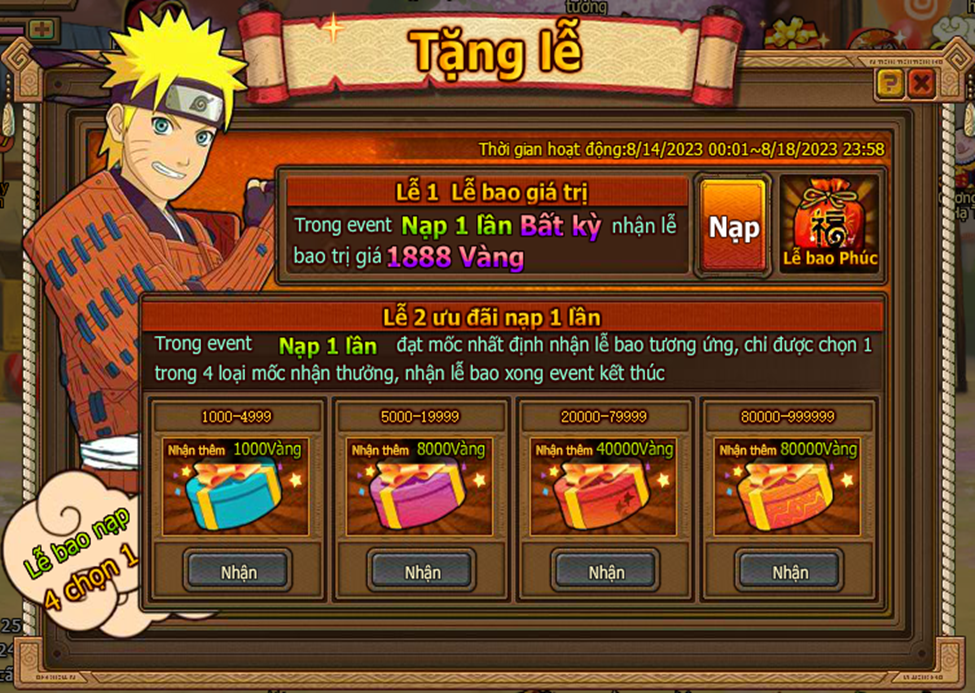 Trong thời gian event nạp 1 lần đạt mức chỉ định , nhận trả lễ vàng .