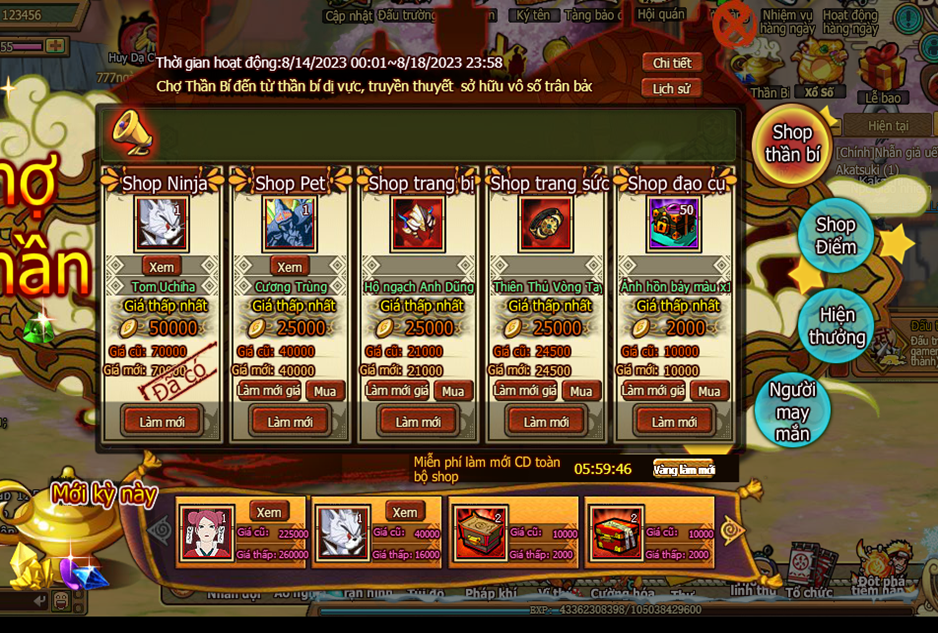 2. Trong chợ thần bí có 5 loại shop , phân biệt gồm shop ninja , shop pet , shop trang bị , shop trang sức và shop đạo cụ , mỗi shop đều bán loại vật phẩm tương ứng