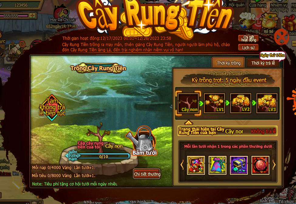 Mỗi kỳ thường nếu trong 24h chưa nhận , 00:30 ngày tiếp theo hệ thống gửi trả lễ qua thư cho người chơi , xin đừng lo lắng