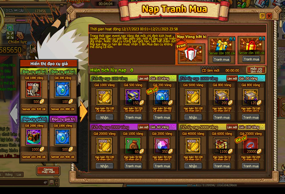 1. Trong thời gian event nạp Vàng đạt mốc chỉ định kích hoạt quyền mua đạo cụ giới hạn giảm giá: một số đạo cụ còn miễn phí nhận.