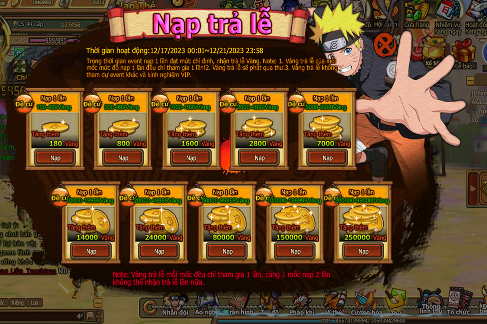 Trong thời gian event nạp 1 lần đạt mức chỉ định , nhận trả lễ vàng .