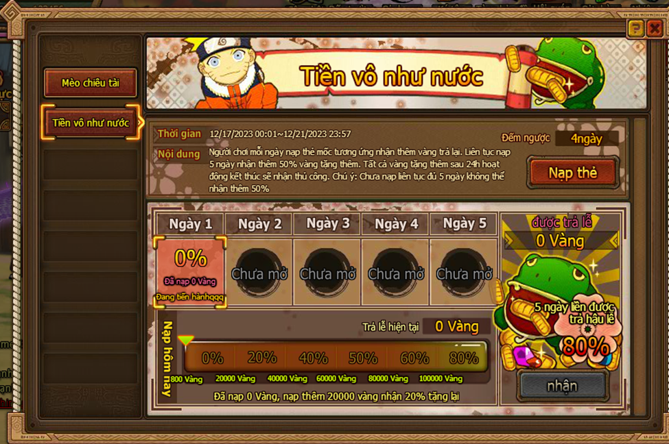 1. Người chơi mỗi ngày nạp thẻ mốc tương ứng nhận thêm vàng trả lại. Liên tục nạp 5 ngày nhận thêm 80% vàng tặng thêm. Tất cả vàng tặng thêm sau 24h hoạt động kết thúc sẽ nhận thủ công. Chú ý: Chưa nạp liên tục đủ 5 ngày không thể nhận thêm 80%.