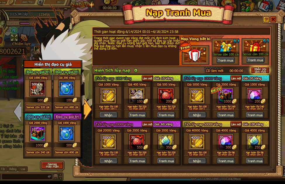 1. Trong thời gian event nạp Vàng đạt mốc chỉ định kích hoạt quyền mua đạo cụ giới hạn giảm giá: một số đạo cụ còn miễn phí nhận.