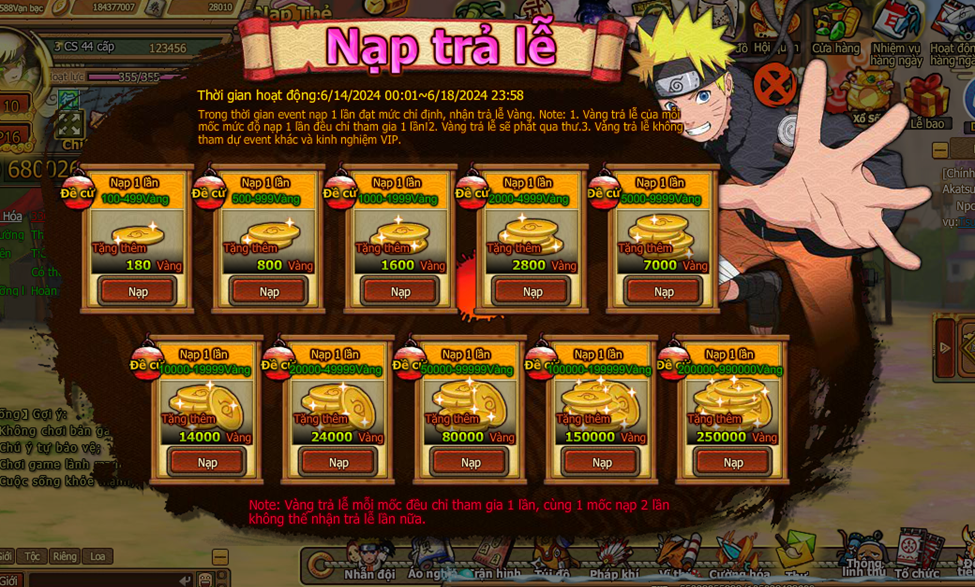 Trong thời gian event nạp 1 lần đạt mức chỉ định , nhận trả lễ vàng