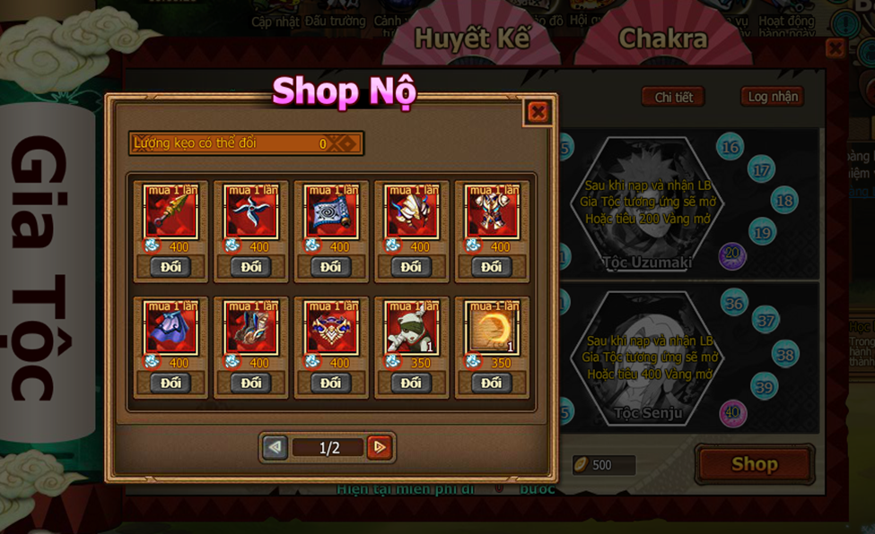8. Nếu chưa tham dự hoạt động Huyết Kế, có thể trực tiếp tiêu Vàng mở bàn cờ. Nếu người chơi trực tiếp bấm bàn cờ Tộc Hyuga, hiển thị tiêu 100 Vàng, sau khi mua thành công bàn cờ mở ra, nếu chưa mở bàn cờ Tộc Hyuga, hiển thị tiêu 100 vàng, sau khi mua thành công bàn cờ mở ra, nếu chưa mở bàn cờ Tộc Hyuga, trực tiếp bấm bàn cờ Tộc Uzumaki, sẽ hiển thị tiêu 300 Vàng (100 Vàng của bàn cờ Tộc Hyuga + 200 Vàng của bàn cờ Tộc Uzumaki), mua xong trực tiếp mở bàn cờ Tộc Hyuga và Tộc Uzumaki.