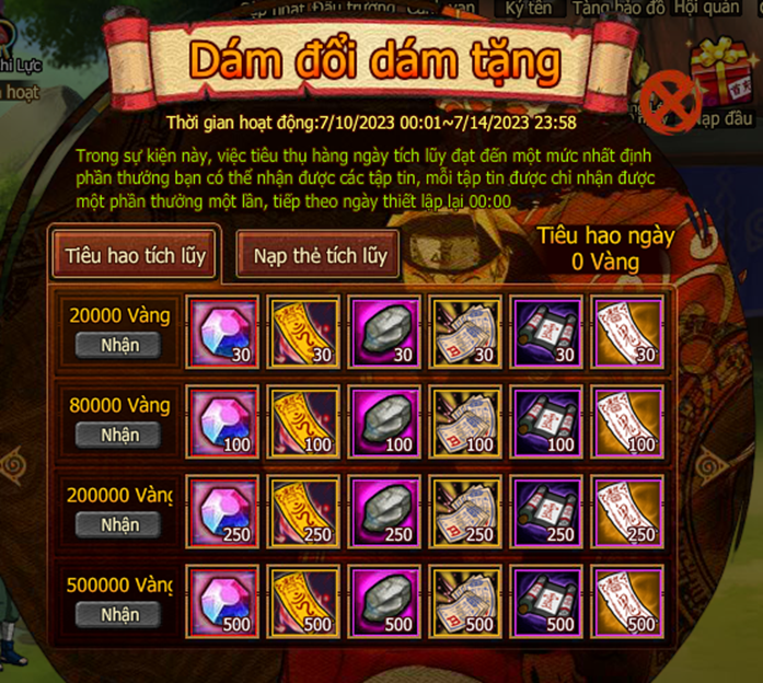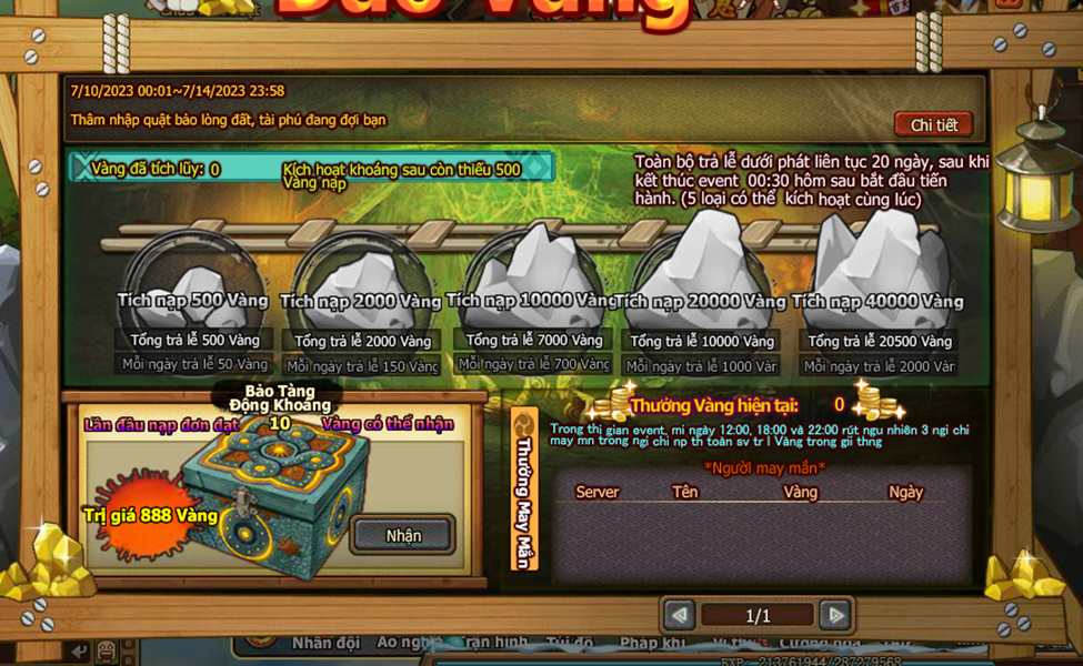 5. Trong thời gian event , nạp 1 lần đầu tiên thỏa nhận thêm bảo tàng khoáng . Trong thời gian , thống kê mức nạp của người chơi toan sv đến giải thưởng may mắn , Mổi nạp 1 Vàng giải thưởng tăng 1 Vàng , mỗi ngày 12:00, 18:00, 22:00 rút ngẫu nhiên 3 người chơi may mắn trong người chơi nạp thẻ toàn sv trả lễ Vàng