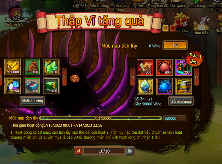 1. Hoạt động có 10 mục, cần tích lũy nạp thẻ để kích hoạt.