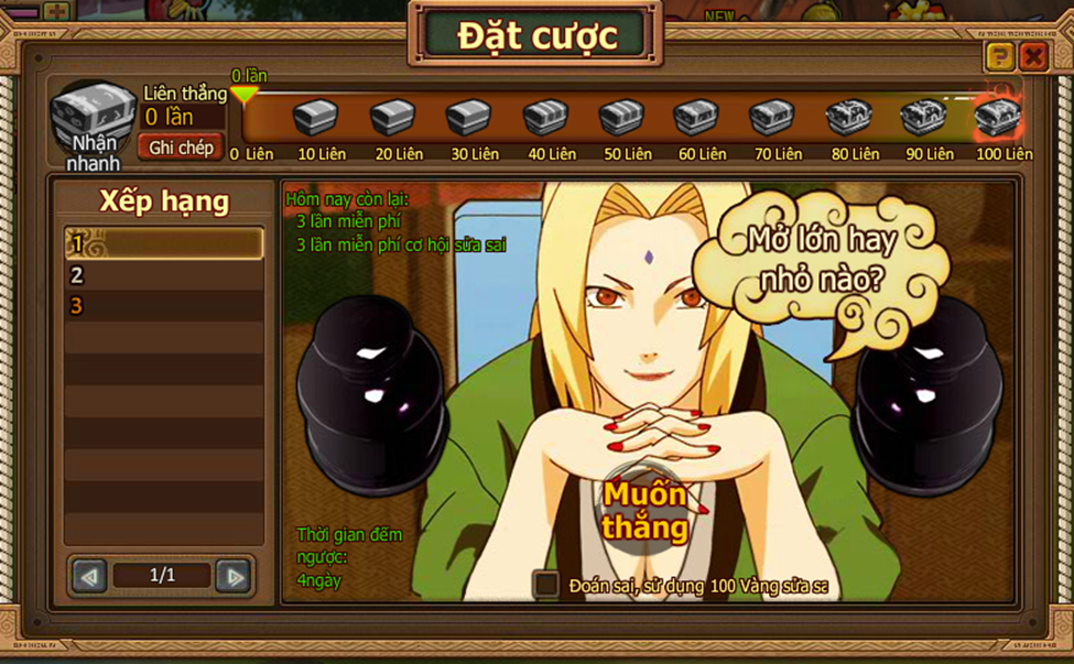 2. Thi đấu bắt đầu khi người chơi điểm số mình lớn hơn hay nhở hơn điểm của Tsunade, nhấn vào nút Lớn hoặc Nhỏ.
