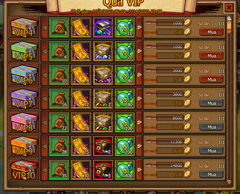 Cấp vip tương ứng sẽ được mua , mua bằng vàng hoặc lễ kim