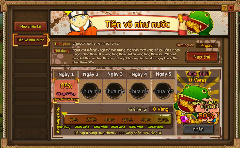 1. Người chơi mỗi ngày nạp thẻ mốc tương ứng nhận thêm vàng trả lại. Liên tục nạp 5 ngày nhận thêm 80% vàng tặng thêm. Tất cả vàng tặng thêm sau 24h hoạt động kết thúc sẽ nhận thủ công. Chú ý: Chưa nạp liên tục đủ 5 ngày không thể nhận thêm 80%.