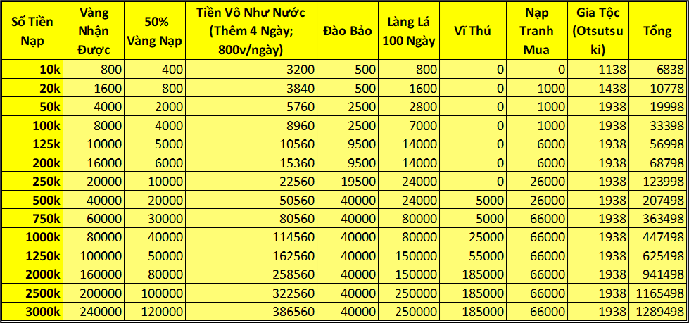 Trong thời gian event nạp 1 lần đạt mức chỉ định , nhận trả lễ vàng .