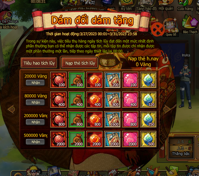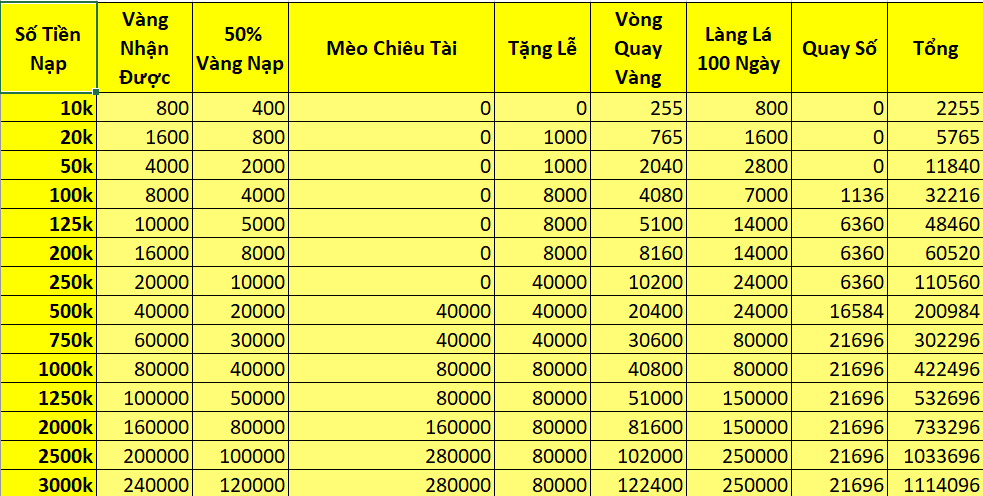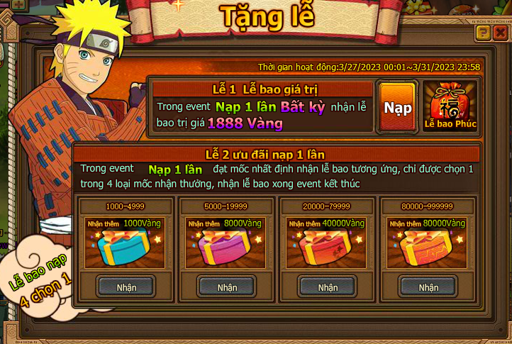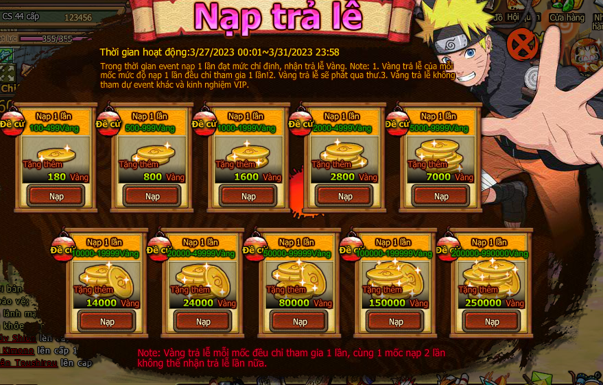 Trong thời gian event nạp 1 lần đạt mức chỉ định , nhận trả lễ vàng .