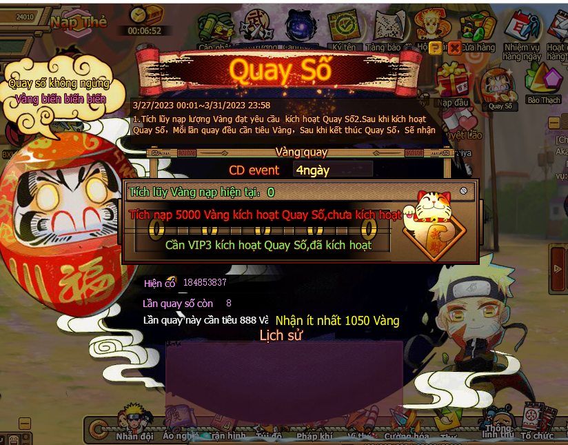 3. Trong thời gian event , người chơi tiêu đủ 1000 vàng nhận 1 lần cơ hội vòng quay lễ kim , mỗi ngày nhiều nhất có thể nhận 20 lần