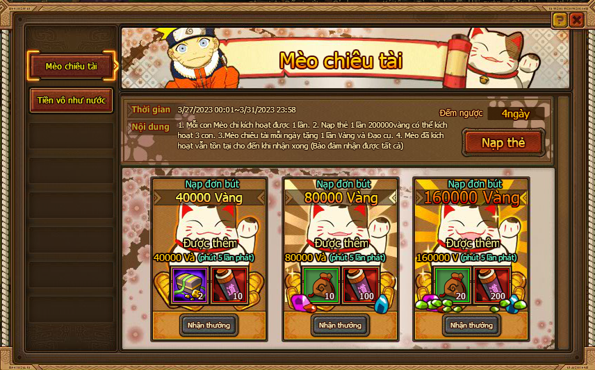 3. Mèo chiêu tài mỗi ngày tặng 1 lần Vàng và đạo cụ.
