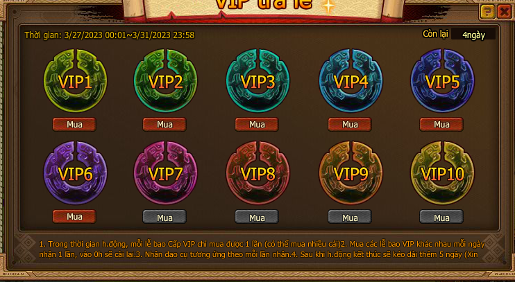 1. Trong thời gian hoạt động, mỗi lễ bao Cấp VIP chỉ mua được một lần (có thể mua nhiều cái)