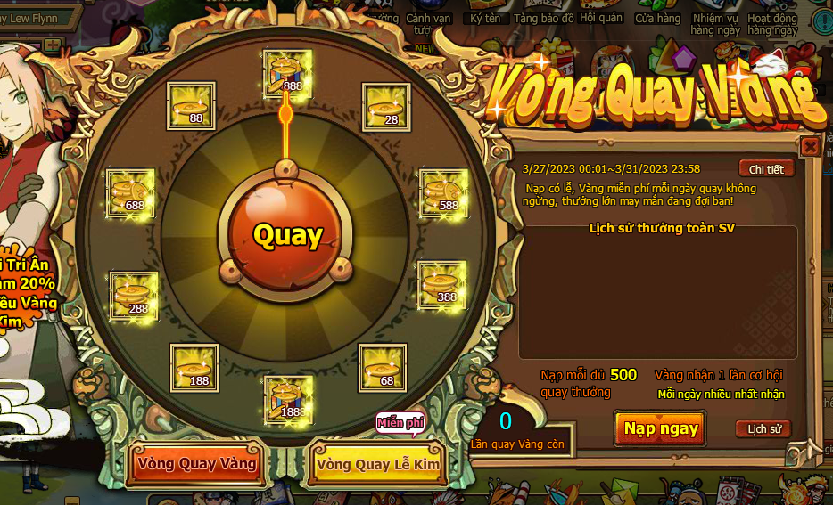 1. Trong thời gian event , người chơi nạp đủ 500 vàng nhận 1 lần cơ hội quay (vòng quay vàng)