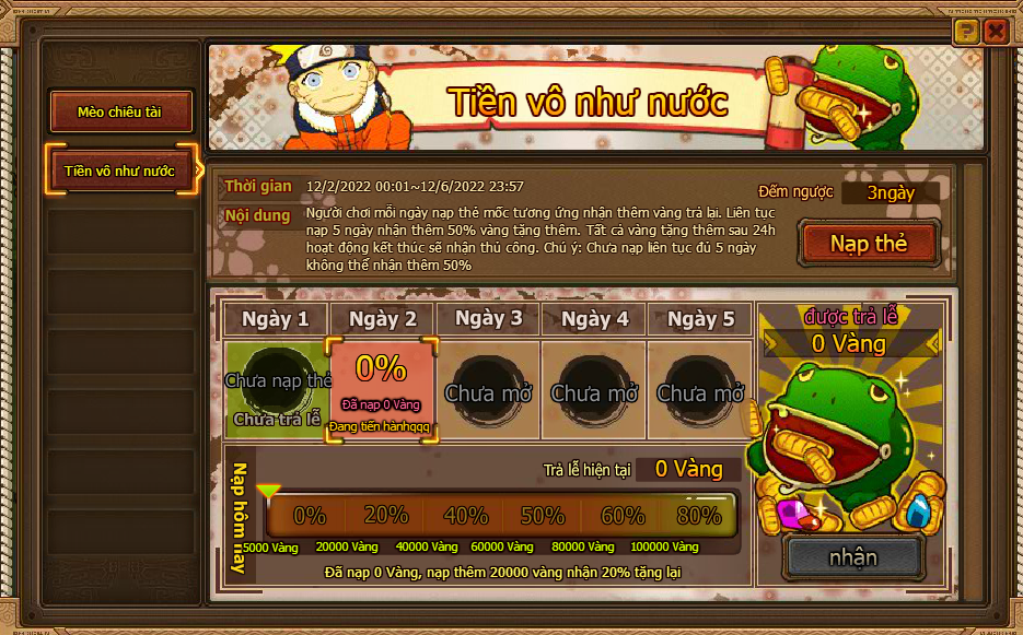 Liên tục nạp 5 ngày nhận thêm 80% vàng tăng thêm.