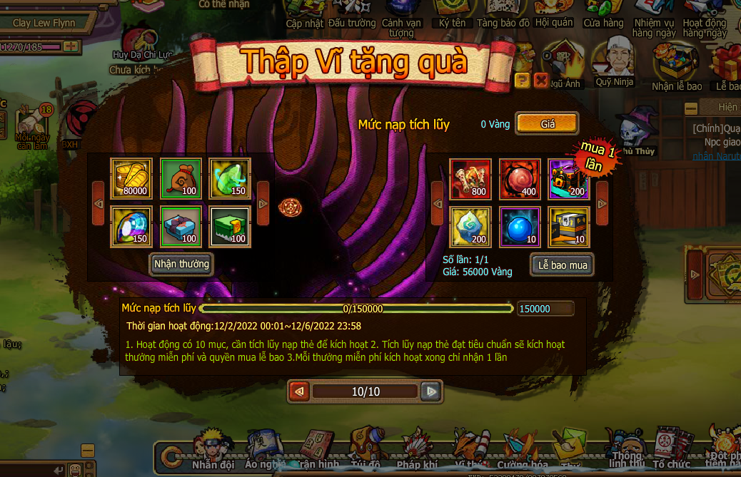 1. Hoạt động có 10 mục, cần tích lũy nạp thẻ để kích hoạt.