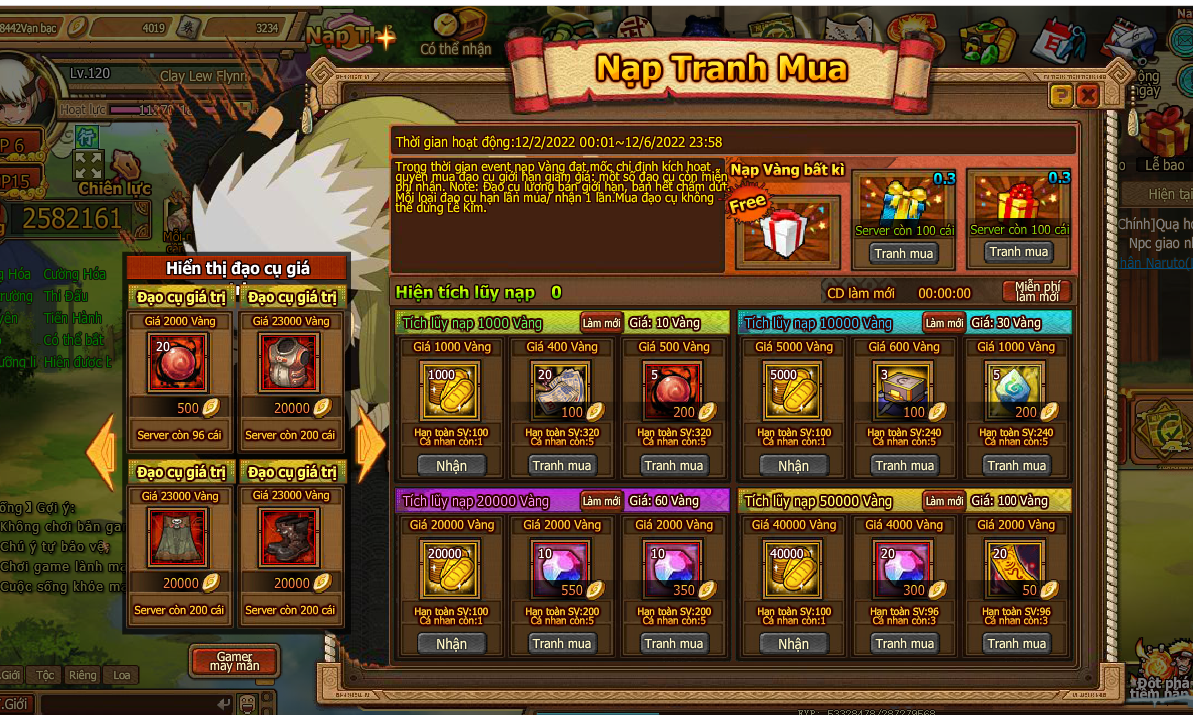 Trong thời gian event nạp Vàng đạt mốc chỉ định kích hoạt quyền mua đạo cụ giới hạn giảm giá; một số đạo cụ còn miễn phí nhận