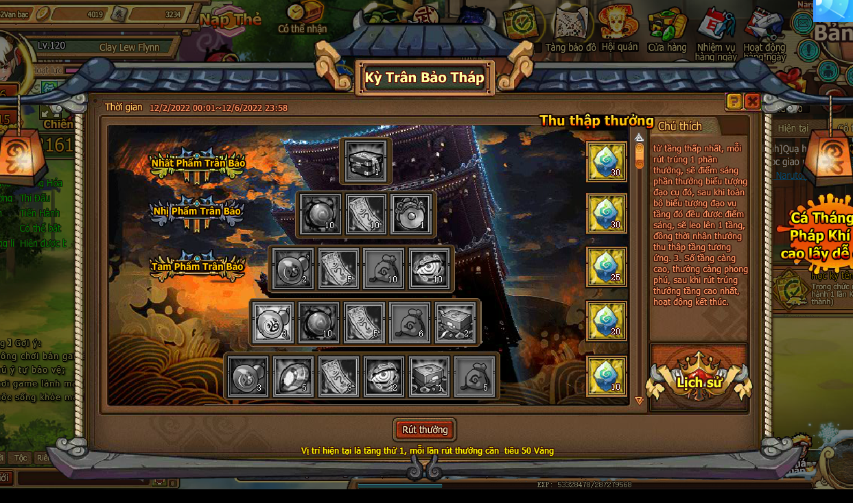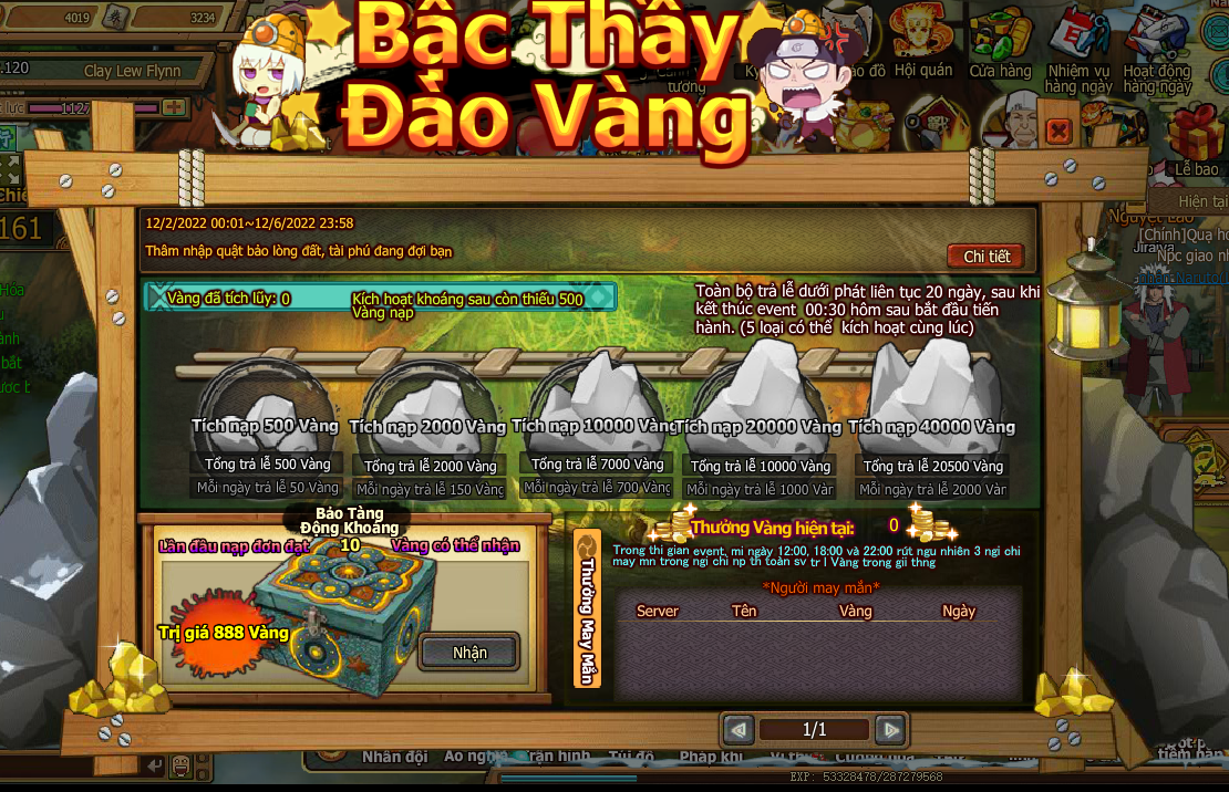 5. Trong thời gian event , nạp 1 lần đầu tiên thỏa nhận thêm bảo tàng khoáng . Trong thời gian , thống kê mức nạp của người chơi toan sv đến giải thưởng may mắn , Mổi nạp 1 Vàng giải thưởng tăng 1 Vàng , mỗi ngày 12:00, 18:00, 22:00 rút ngẫu nhiên 3 người chơi may mắn trong người chơi nạp thẻ toàn sv trả lễ Vàng