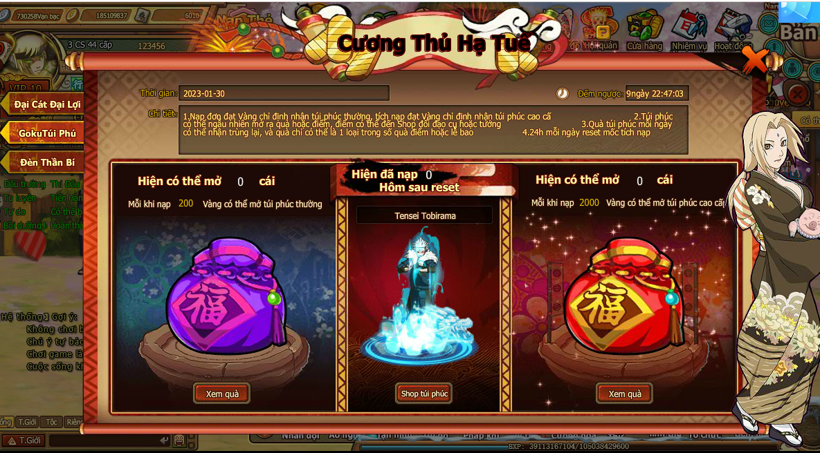 2. Túi phúc có thể ngẫu nhiên mở ra quà hoặc điểm, điểm có thể đến Shop đổi đạo cụ hoặc tướng.
