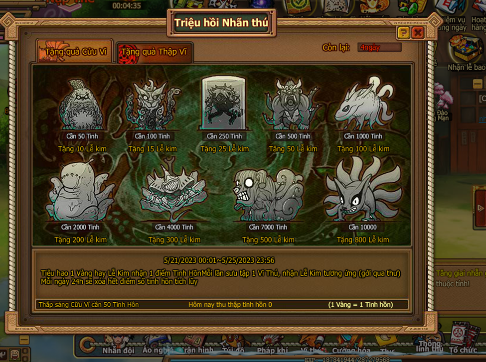 4. Tiêu hao 1 vàng/ lễ kim nhận tinh hồn , thu thập đủ điều kiện nhận rương quà qua thư