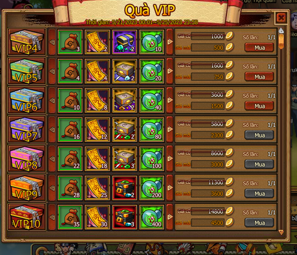 Cấp vip tương ứng sẽ được mua , mua bằng vàng hoặc lễ kim
