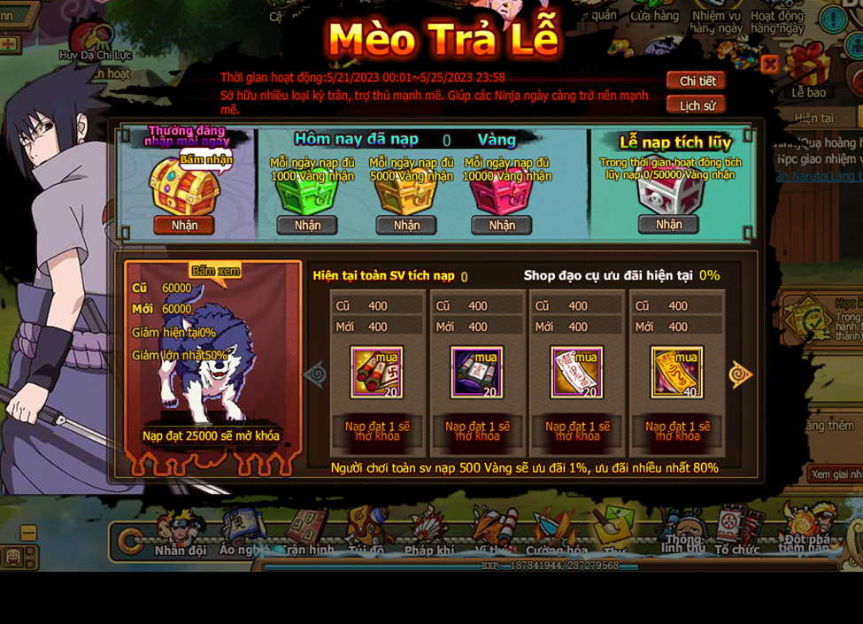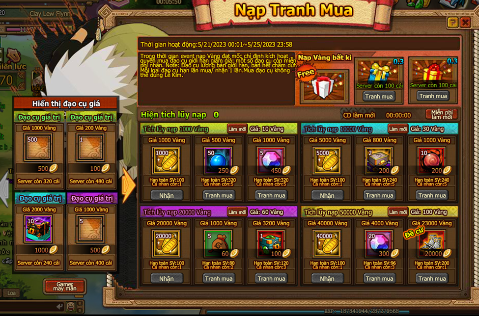 1. Trong thời gian event nạp Vàng đạt mốc chỉ định kích hoạt quyền mua đạo cụ giới hạn giảm giá: một số đạo cụ còn miễn phí nhận.