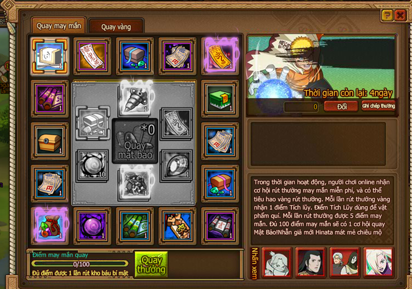 Trong thời gian hoạt động, người chơi online nhận cơ hội rút thưởng may mắn miễn phí, và có thể tiêu hao vàng và lễ kim rút thưởng. Mỗi lần rút thưởng vàng nhận 1 điểm tích lũy. Điểm Tích Lũy dùng để vật phẩm quý. Mỗi lần rút thưởng được 5 điểm may mắn. Đủ 100 điểm may mắn sẽ có 1 cơ hội quay Mật Bảo