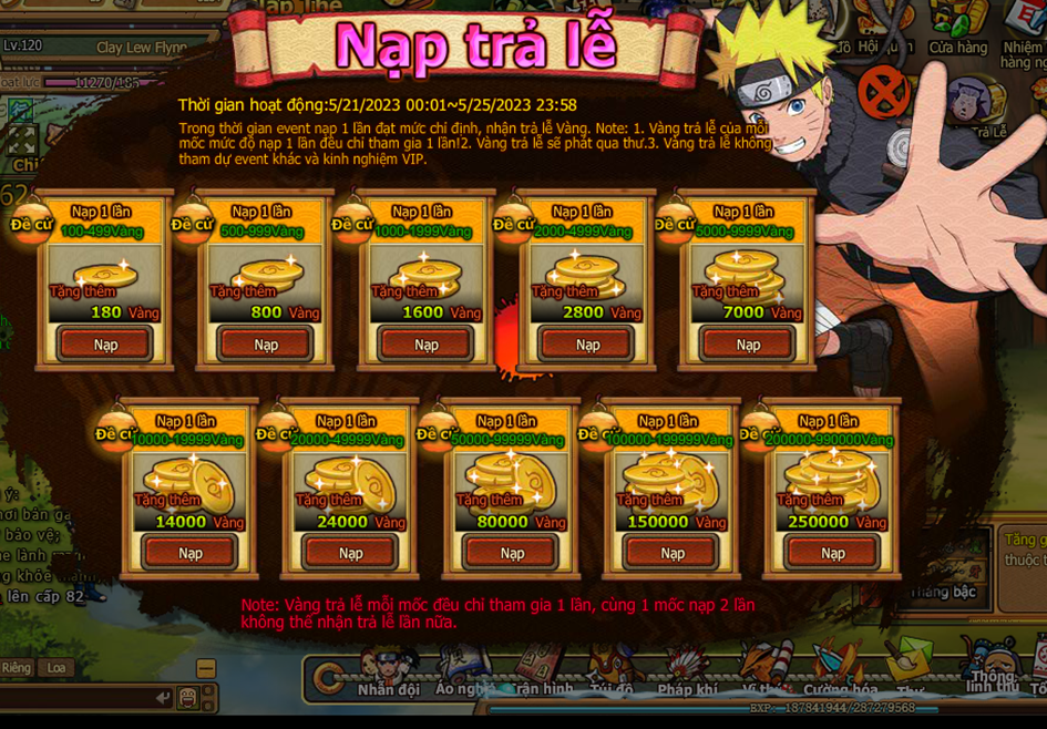 Trong thời gian event nạp 1 lần đạt mức chỉ định , nhận trả lễ vàng .