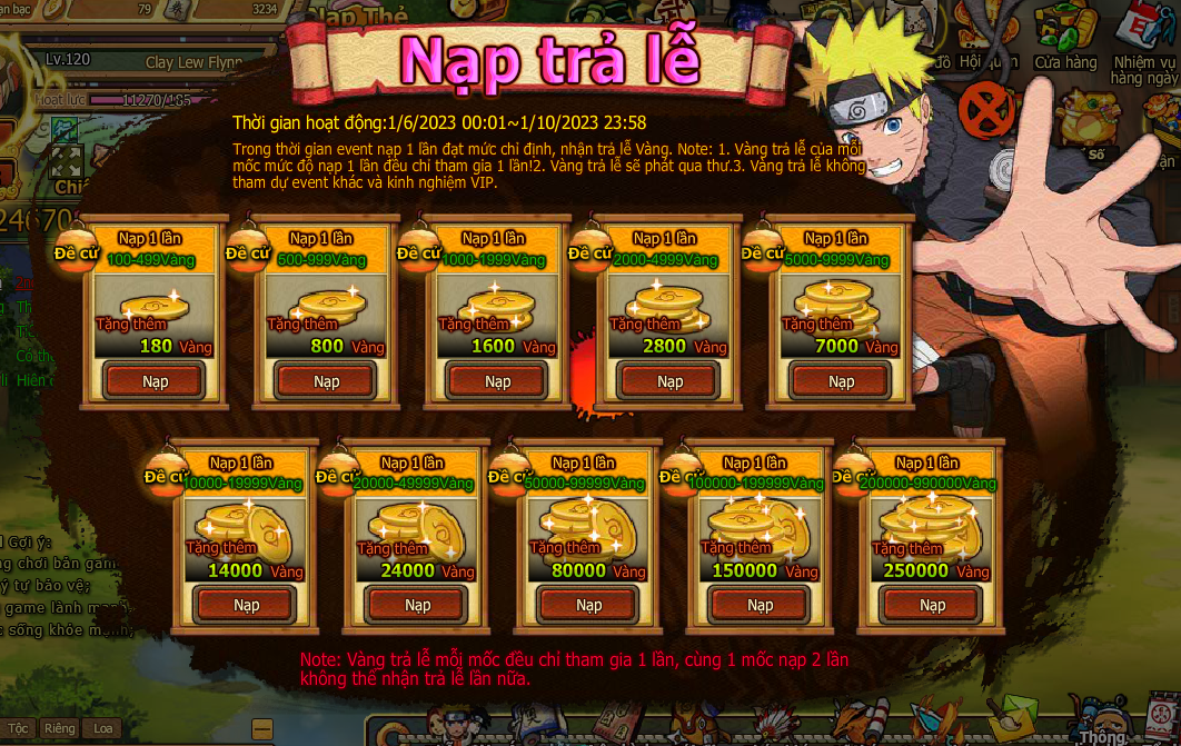 Trong thời gian event nạp 1 lần đạt mức chỉ định , nhận trả lễ vàng .