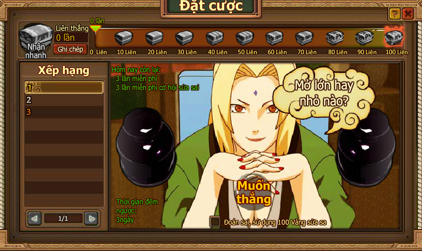 1.Thi đấu bắt đầu khi người chơi điểm số mình lớn hơn hay nhỏ hơn điểm của Tsunade, nhấn vào nút Lớn hoặc Nhỏ