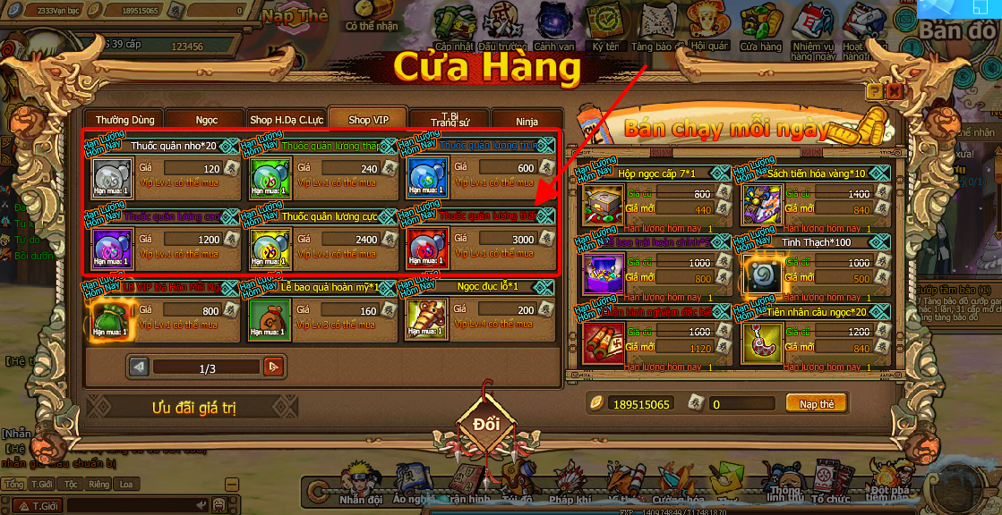( Hình Ảnh : Shop VIP Và Các Vật Phẩm Kinh Nghiệm Được Bày Bán )