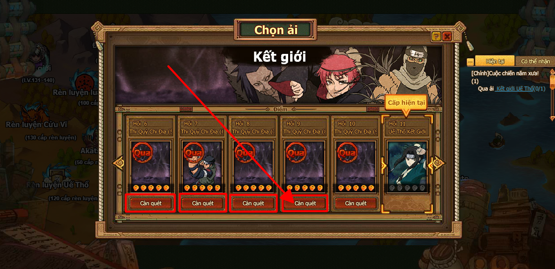Để tiến hành càn quét ải, quý ninja hãy vào lại giao diện phó bản và bấm chọn vào "Càn Quét" ở dưới ải mong muốn như hình ảnh sau đây :