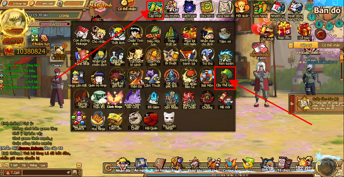 Để mở giao diện tính năng cây thế giới quý ninja hãy bấm vào nút "Cập Nhật" và sau đó bấm tiếp vào nút "Cây Thế Giới" như hình ảnh sau đây :