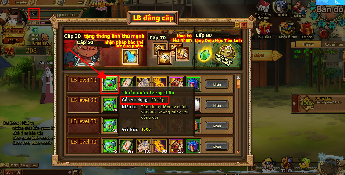Tại giao diện ưu đãi này quý ninja khi đạt cấp tương ứng sẽ được nhận phần thưởng. Lưu ý : Vật phẩm tăng kinh nghiệm này cần phải đạt cấp 20 trở lên mới có thể sử dụng được.
