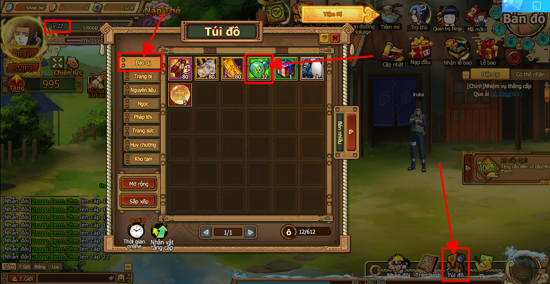 Sau khi đạt cấp 20 trở lên và nhận vật phẩm hỗ trợ tăng cấp nhanh, quý ninja hãy vào mục túi đồ bấm chọn vào vật phẩm hỗ trợ để sử dụng tiến hành tăng cấp nhanh