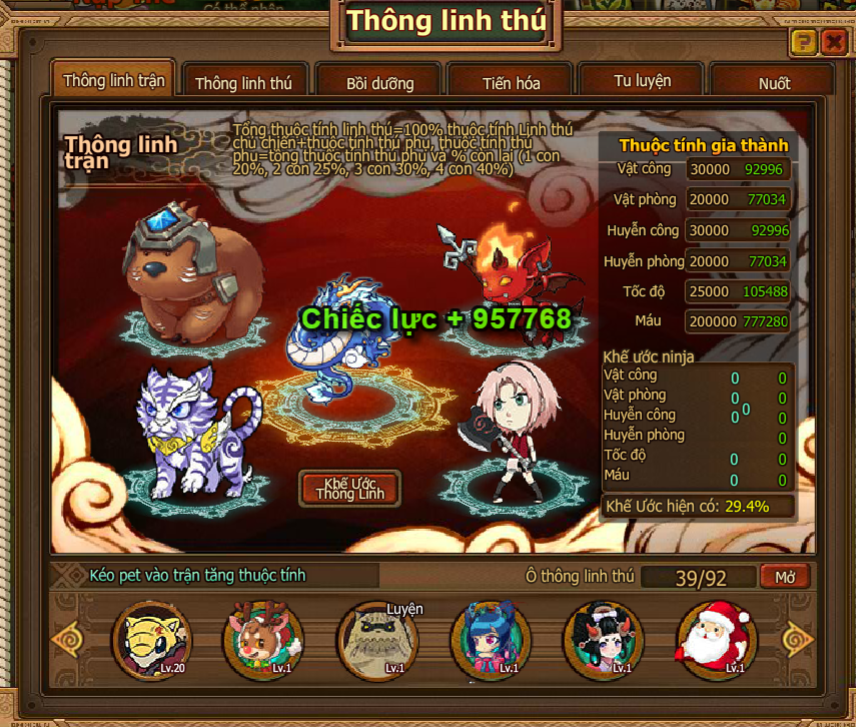 Đầu sever các bạn cần kiếm 5 con pet xịn để lắp vào 5 vị trí trong thông linh thú hoặc ít nhất là có 1 con pet xịn để lắp vào ô giữa ( pet chủ lực ), pet lắp vào ô giữa phải là con có chỉ số cao nhất trong 5 con è Giúp tăng nhiều lực chiến