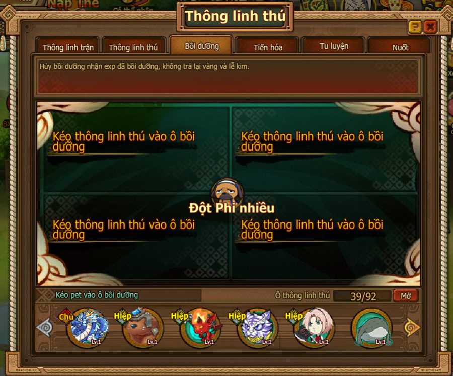 Sau khi đã có pet chủ lực thì các bạn nên nuôi nó lên cấp càng cao càng tốt ở mục bồi dưỡng ( có thể nuôi pet bằng cách bồi dưỡng hoặc đột phi phù thạch )