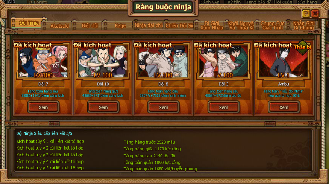 Nông dân thì nên kích hoạt 3 liên kết: Đội Ninja, Akatsuki, Biệt đội
