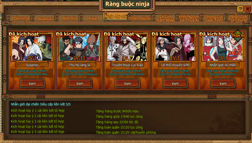 Nếu nạp nhiều, có nhiều vàng thì có thể kích thêm liên kết Ninja đại chiến è tăng rất nhiều lực chiến.