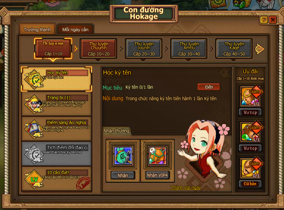 Ở các mốc cấp khác nhau (Cấp 1~10, 10~20, 20~30, 30~40 …) sẽ mở những nhiệm vụ và ưu đãi khác nhau . Vậy nên khi khi các bạn lên cấp thì hãy nhấp vào Con đường Hokage để có thể mua được những vật phẩm (hộp ngọc, phù pháp khí, hoạt lực,…) cần thiết để không bị thọt đồ so với người khác .