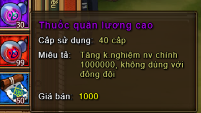 Có 4 loại thuốc quân lương như hình trên dùng để tăng cấp nhân vật chính, nhân vật chính đạt cấp 120 và cấp tiêm năng đạt 100 thì có thể chuyển sinh