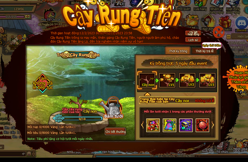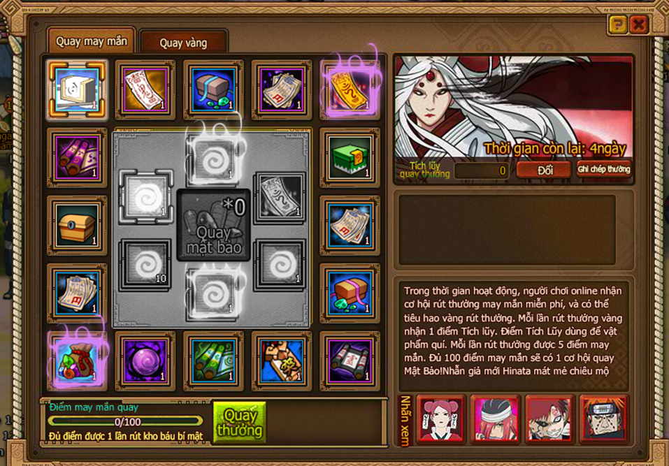 Trong thời gian hoạt động, người chơi online nhận cơ hội rút thưởng may mắn miễn phí, và có thể tiêu hao vàng và lễ kim rút thưởng. Mỗi lần rút thưởng vàng nhận 1 điểm tích lũy. Điểm Tích Lũy dùng để vật phẩm quý. Mỗi lần rút thưởng được 5 điểm may mắn. Đủ 100 điểm may mắn sẽ có 1 cơ hội quay Mật Bảo