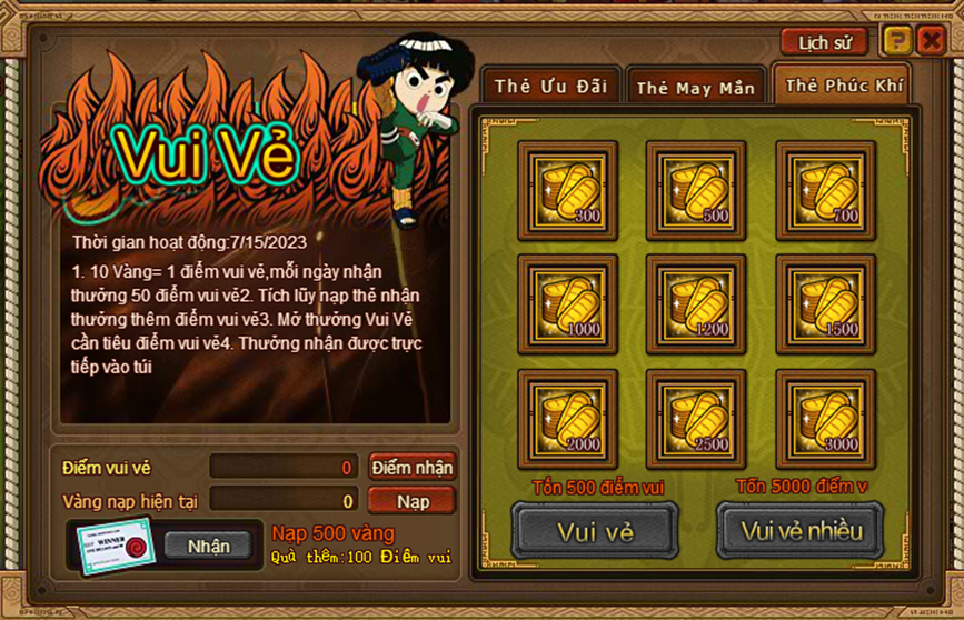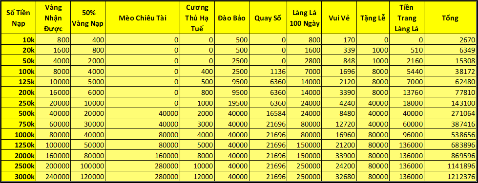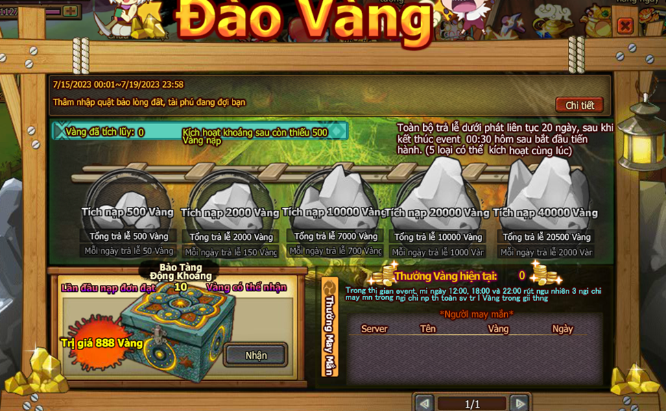 5. Trong thời gian event , nạp 1 lần đầu tiên thỏa nhận thêm bảo tàng khoáng . Trong thời gian , thống kê mức nạp của người chơi toan sv đến giải thưởng may mắn , Mổi nạp 1 Vàng giải thưởng tăng 1 Vàng , mỗi ngày 12:00, 18:00, 22:00 rút ngẫu nhiên 3 người chơi may mắn trong người chơi nạp thẻ toàn sv trả lễ Vàng