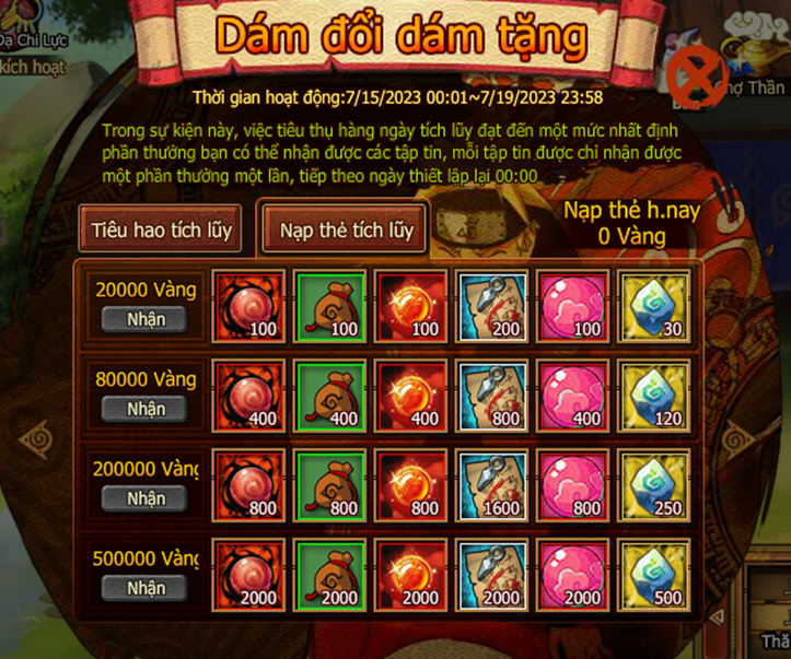 + Từ ngày 15.7 đến 19.7 nạp đạt các mốc tương ứng sẽ nhận phần thưởng
