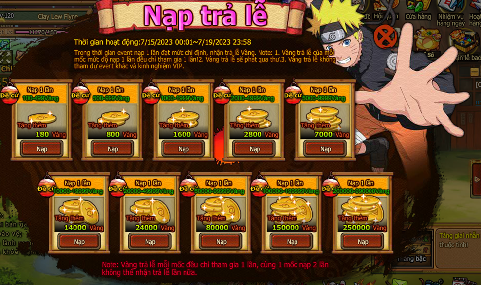 Trong thời gian event nạp 1 lần đạt mức chỉ định , nhận trả lễ vàng .