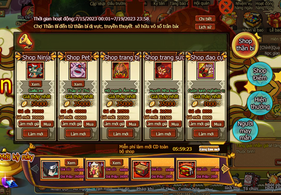 2. Trong chợ thần bí có 5 loại shop , phân biệt gồm shop ninja , shop pet , shop trang bị , shop trang sức và shop đạo cụ , mỗi shop đều bán loại vật phẩm tương ứng