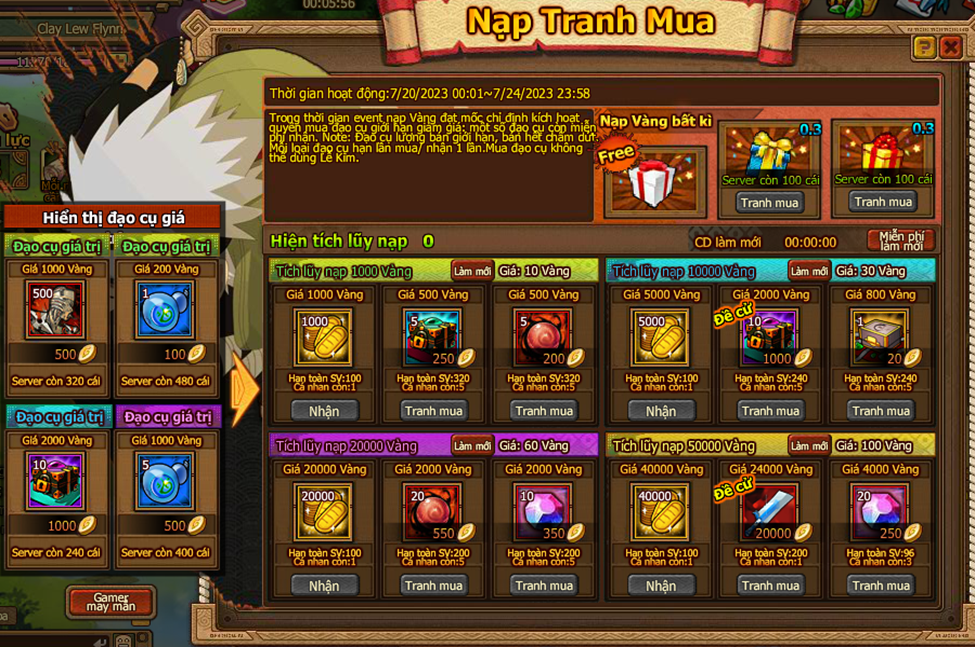 1. Trong thời gian event nạp Vàng đạt mốc chỉ định kích hoạt quyền mua đạo cụ giới hạn giảm giá: một số đạo cụ còn miễn phí nhận.